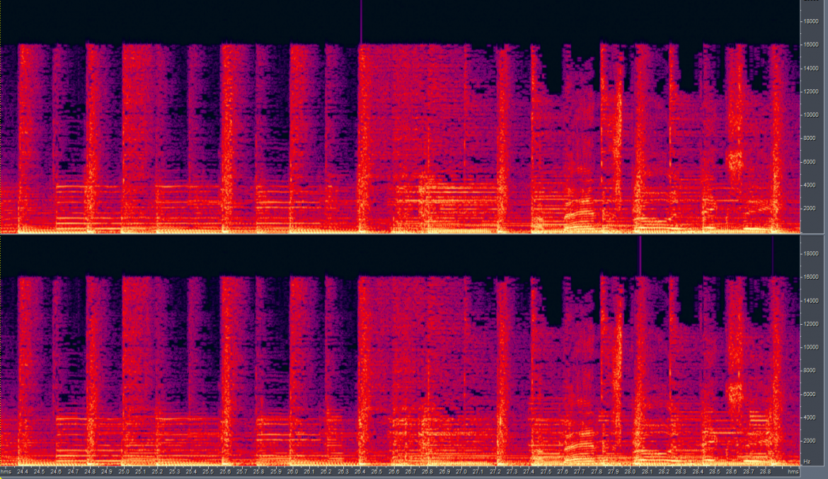 This might be the place where I should mention why stacking codecs is a really bad idea. AAC for example makes different tradeoffs than MP3, and suffers far less from the 'holes in the spectrum' issue. But, if you feed MP3 encoded audio to an AAC codec, that will force it to try to make those holes anyway (because it will also try to avoid adding sounds that weren't there), and hence use its precious bits to describe and recreate those holes. This means that you retain the badness created by the MP3 codec, and add more AAC badness because it has less bits left to encode the sound that you actually want it to encode.